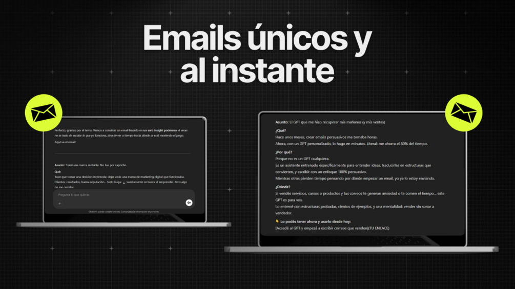 Vas a recibir el link al GPT, una guía paso a paso y 100 emails para inspirarte. Solo necesitás una cuenta gratuita de ChatGPT para empezar.
